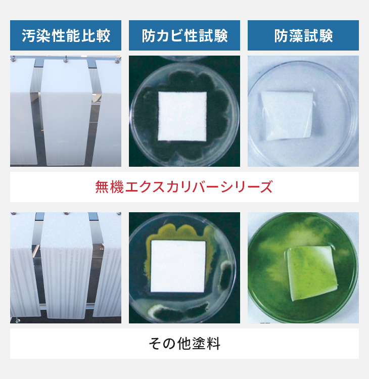 防藻試験や防カビ試験で、他の無機塗料に比べ塗膜周囲に藻やカビの発生が抑制された、優れた防藻・防カビ性能を発揮する無機エクスカリバーZ。