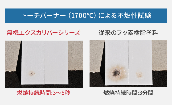 無機成分「オルガノポリシロキサン」最大限化により、シリコン・フッ素塗料や他の無機塗料と比べて塗膜が燃えにくい特徴があります。